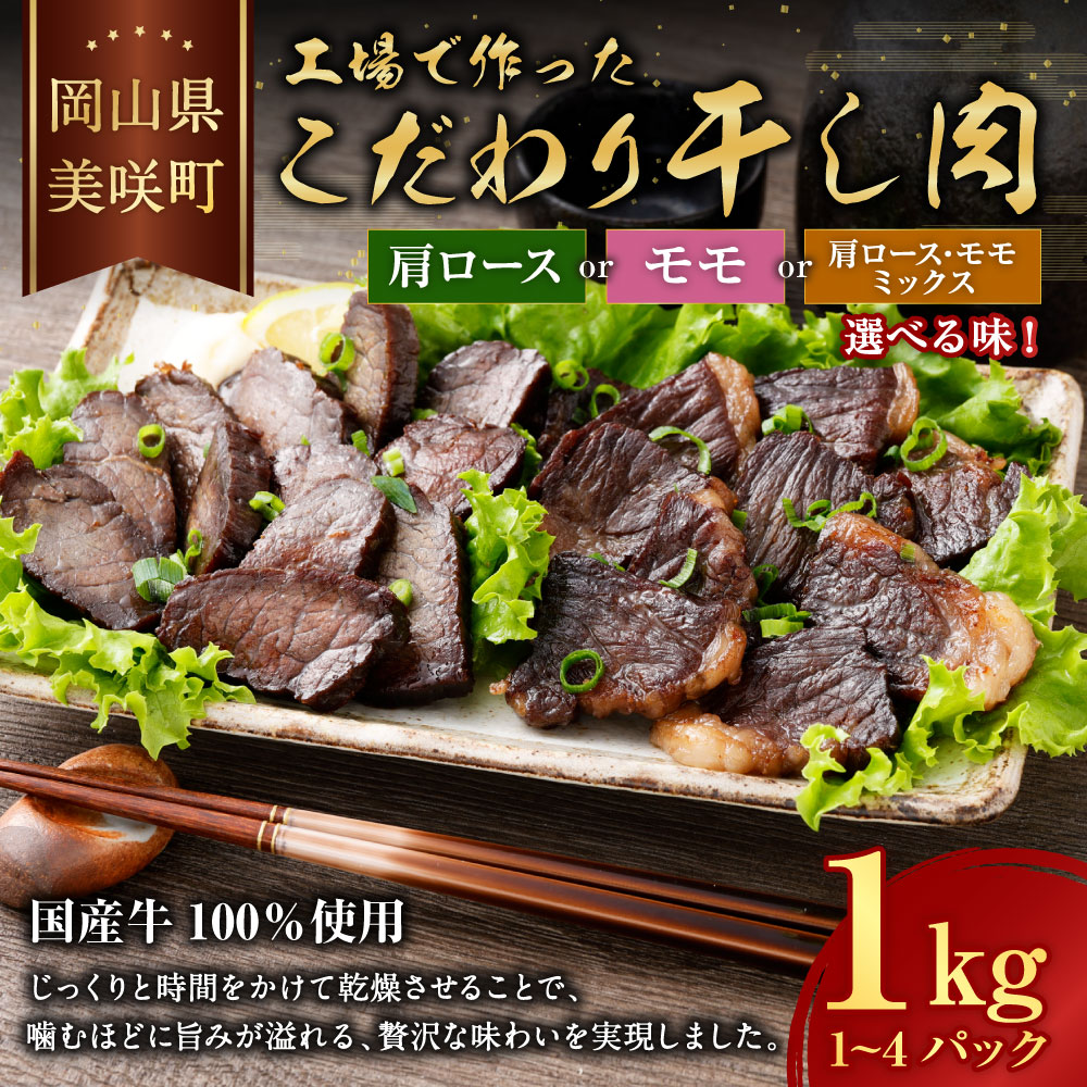 【ふるさと納税】<選べる種類>美咲町工場で作ったこだわり干し肉 約1kg(1~4パック) 肩ロース / モモ / 肩ロース・モモ ミックス 牛肉 お肉 干し肉 アミノ酸 おつまみ お酒のお供 冷蔵 国産 岡山県 美咲町 送料無料