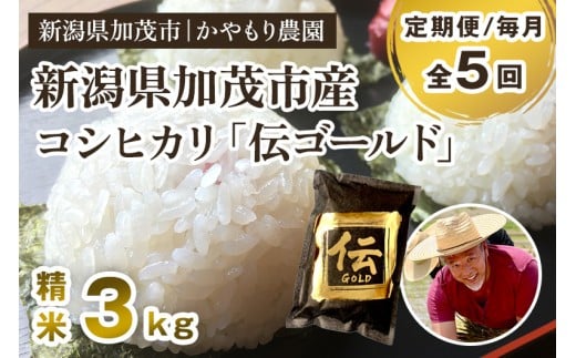 【令和7年産新米】【定期便5回毎月お届け】新潟産コシヒカリ「伝ゴールド」白米真空パック 精米3kg(1.5kg×2) 《9月下旬から順次出荷》 南麻布の高級料亭で提供される極上米 かやもり農園
