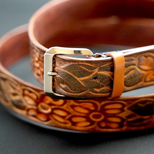 - 【数量限定】牛革ベルト (花柄・焦茶かすれ染め) 【太さ30mm / 厚さ3.7mm / Lサイズ(130cm)】 牛革 牛 革 皮 ベルト 手作り ハンドメイド 花柄 [BE021ya-L]