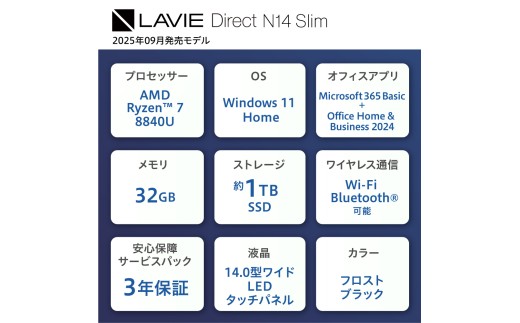 - 【新品】 ノートパソコン 2025年09月発売モデル NEC LAVIE Direct N14 Slim① 14型ワイド AMD Ryzen™ 7 8840U プロセッサ Windows11 HOME 32GB メモリ 1TB SSD Microsoft office フロストブラック