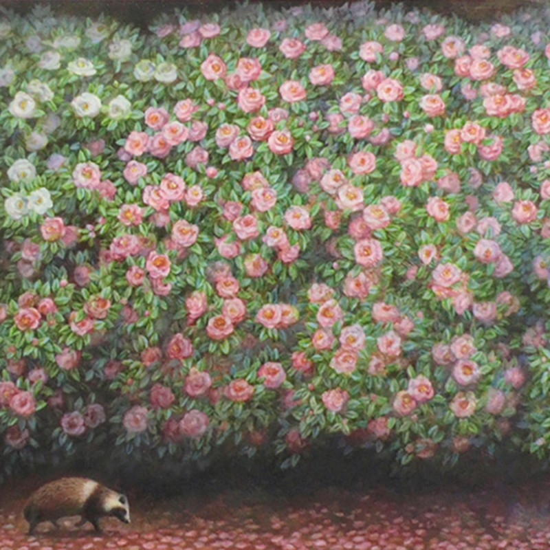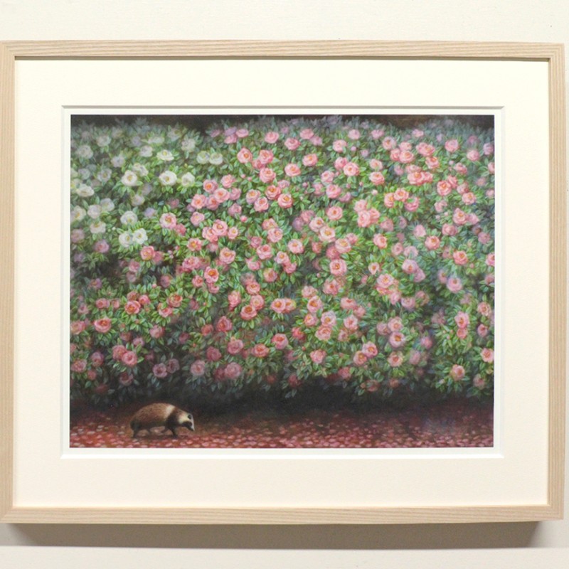 - 池上夏生 額付き高級プリント ”たぬきと山茶花”