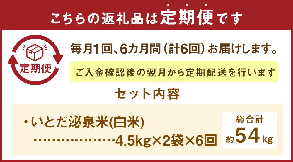 - 【ふるさと納税】【6ヵ月 定期便】 いとだ泌泉米 白米 9kg (4.5kg×2袋) 総合計54kg 6回 元気つくし ご飯 お米 毎月お届け 九州産 福岡県 糸田町産 送料無料