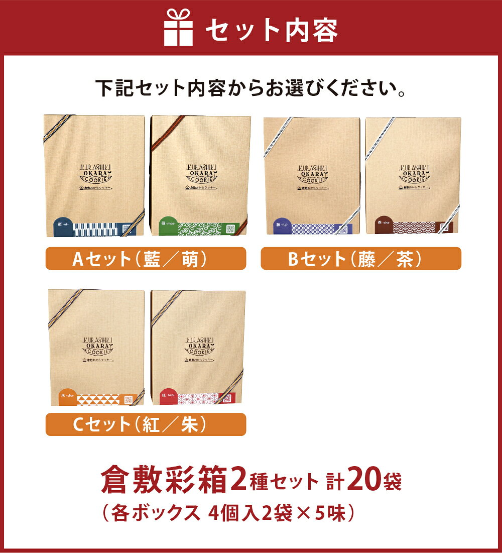 【ふるさと納税】倉敷彩箱 2種セット<選べるセット内容>【A(藍/萌) / B(藤/茶) / C(紅/朱)】 計20袋 おから 米粉 ハーブ 健康 バター チョコチップ クッキー お菓子 洋菓子 焼菓子 スイーツ デザート おやつ 岡山県 倉敷市 送料無料