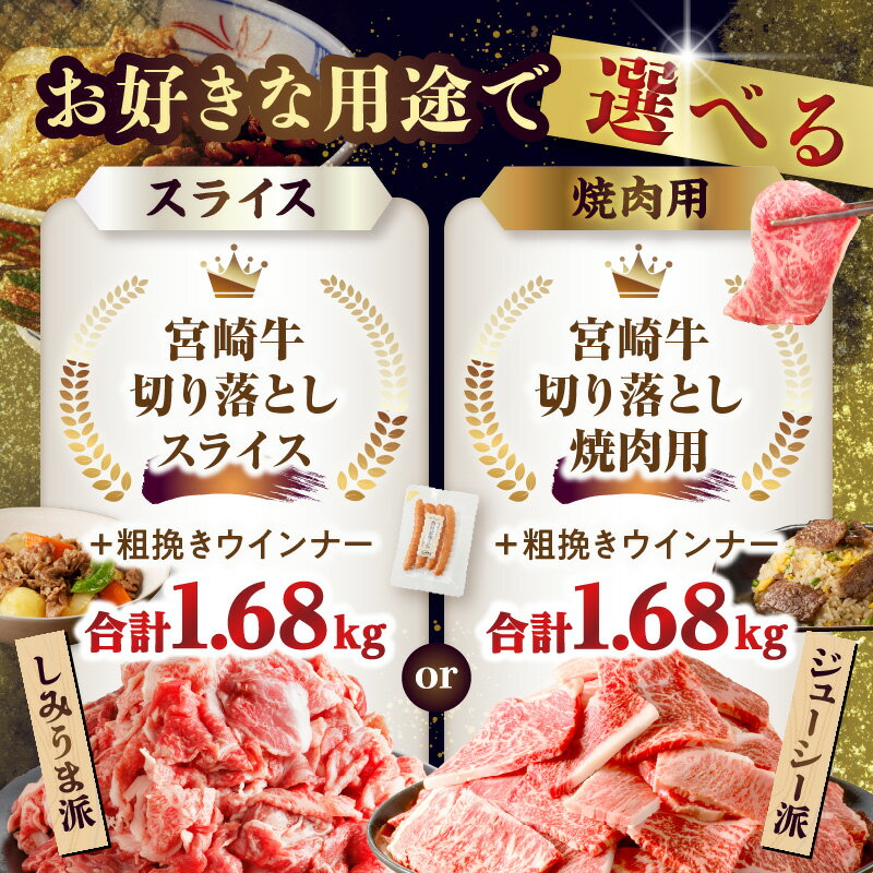 - 【ふるさと納税】【発送月・内容が選べる】≪生産者応援≫ 訳あり 宮崎牛 切り落とし (スライス or 焼肉)&粗挽きウインナー (合計1.68kg) 牛肉 肉 国産 和牛 A4 A5 小分け BBQ すき焼き しゃぶしゃぶ ギフト 贈り物 黒毛和牛 ミヤチク 宮崎県 都農町 送料無料