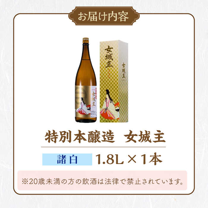 【ふるさと納税】女城主 特別本醸造 諸白 1.8L / 日本酒 女城主 特別本醸造 諸白 地酒 清酒 本醸造酒 枡酒 本醸造 晩酌 食中酒 一升瓶 和酒 辛口 やや辛口 まろやか 冷酒 燗 熱燗 ぬる燗 お酒 お取り寄せ 贈答 ギフト 人気 おすすめ 岐阜県 / 恵那市 / 岩村醸造 [AUAK030]