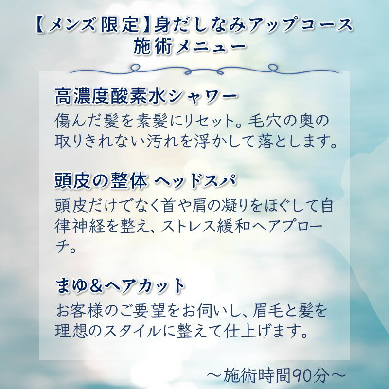 【ふるさと納税】ヘッドスパ&まゆカット ヘアカット 高濃度酸素水 リラクゼーション 髪質ケア 頭皮ケア 身だしなみアップコース 所要時間90分【メンズ限定】