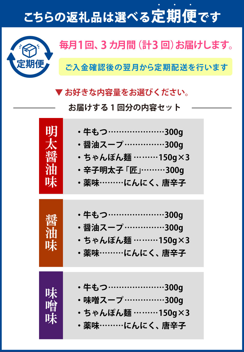 【ふるさと納税】<選べる種類>【3ヶ月定期便】博多もつ鍋 3人前 醤油味・味噌味・明太もつ鍋(醤油味) 1ヶ月毎 3回 牛もつ 牛小腸 牛肉 お肉 ちゃんぽん麺 チャンポン麵 麵類 めんたいこ 辛子明太子 しょうゆ みそ 惣菜 モツ鍋 冷凍 国産 福岡県 遠賀町 送料無料