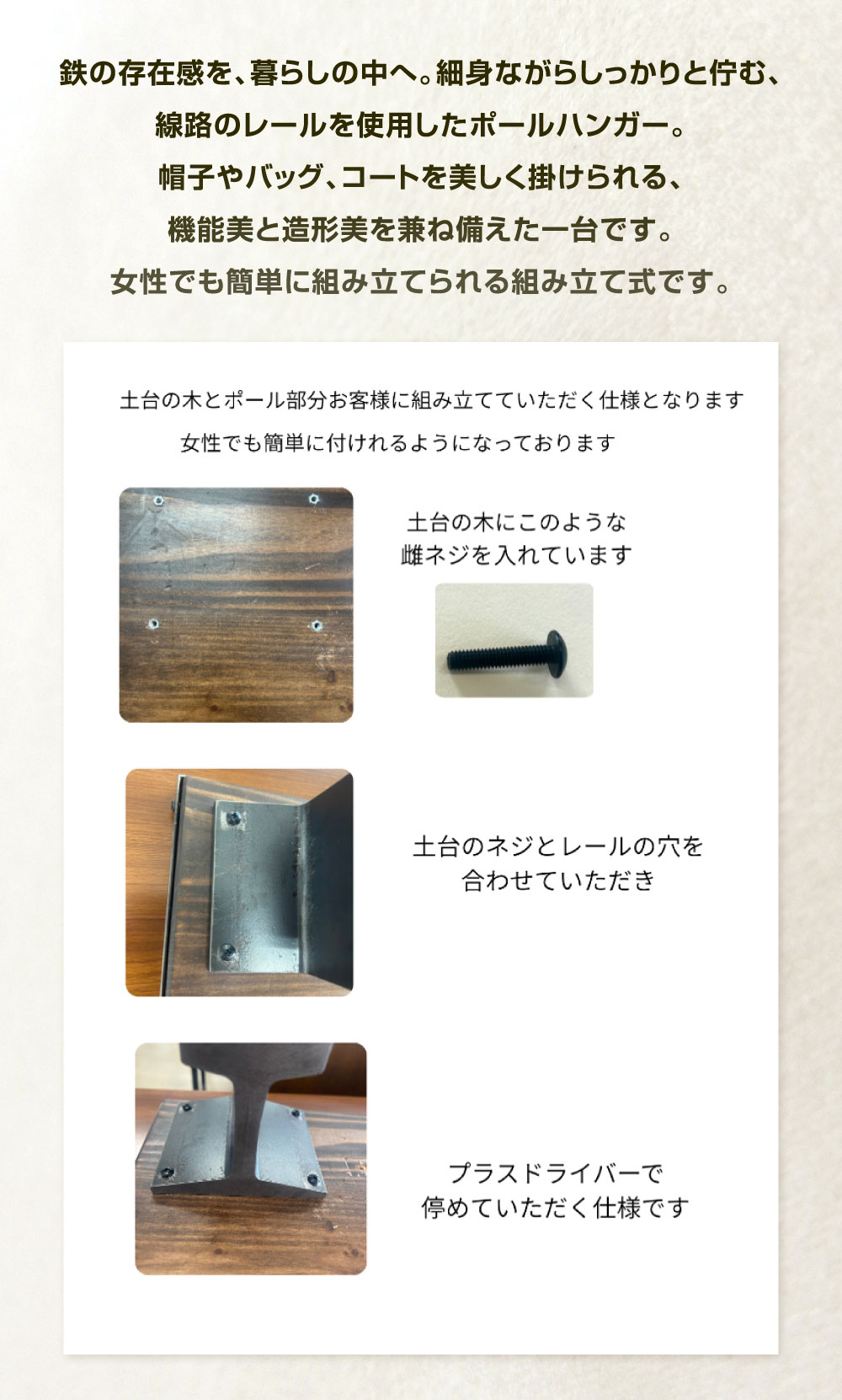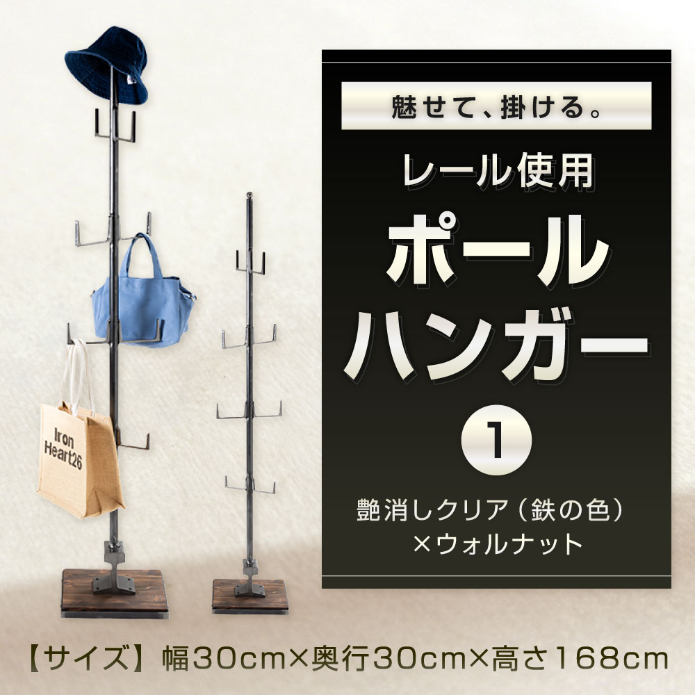 【ふるさと納税】レール使用 ポールハンガー 1 艶消しクリア(鉄の色)×ウォルナット 幅30cm 奥行30cm 高さ168cm 鉄 アイアン ウッド 杉 無垢材 レール ポール ハンガー スタンド 帽子 バッグ インテリア 家具 組立式 福岡県北九州市
