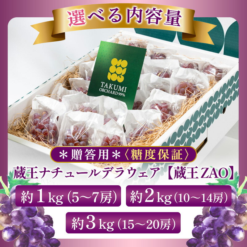 【ふるさと納税】【蔵王 ZAO】蔵王ナチュールデラウェア TAKUMI ORCHARD 99% 贈答 2L以上 糖度保証 約1kg 約2kg 約3kg 山形 山形市 フルーツ 果物 くだもの 送料無料 ぶどう 葡萄 ブドウ 減農薬【令和8年産先行予約】FS25-117