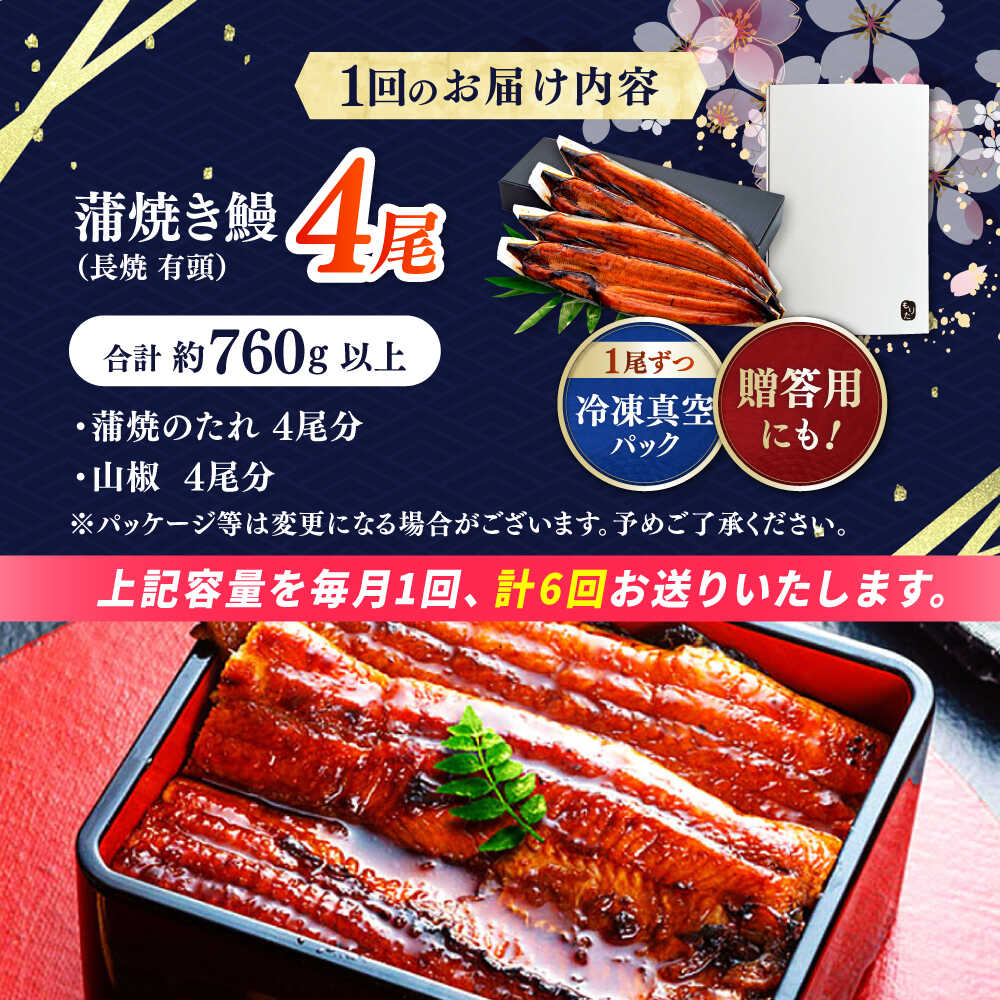 【ふるさと納税】【6回定期便】極上国産うなぎ四万十桜 蒲焼き4尾 たっぷり大サイズ / 国産 高知 四万十 うなぎ ウナギ 鰻 蒲焼き うな重 惣菜 贅沢 【有限会社もりた】[ATHE011]