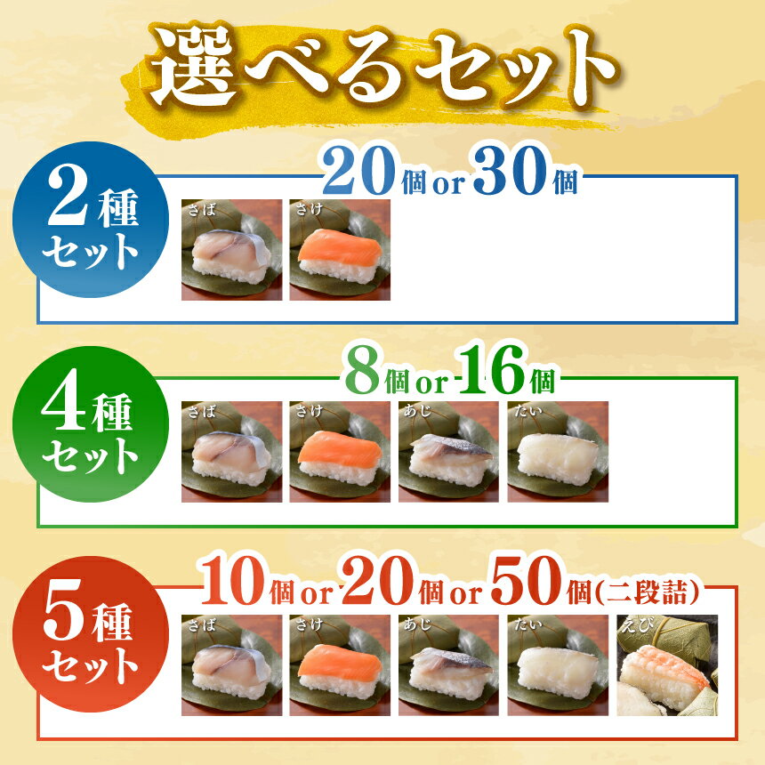 - 【ふるさと納税】柿の葉寿司 選べる 寿司 鮨 <2種:20個 or 30個><4種:8個 or 16個>< 5種:10個 or 20個 or 50個> 【 配達指定日:2週間以降の日付】 | お祝い すし 寿司 スシ お寿司 おすし 柿の葉ずし 鯖 鮭 鯵 鯛 さば さけ あじ たい 贈答用 奈良県 上北山村