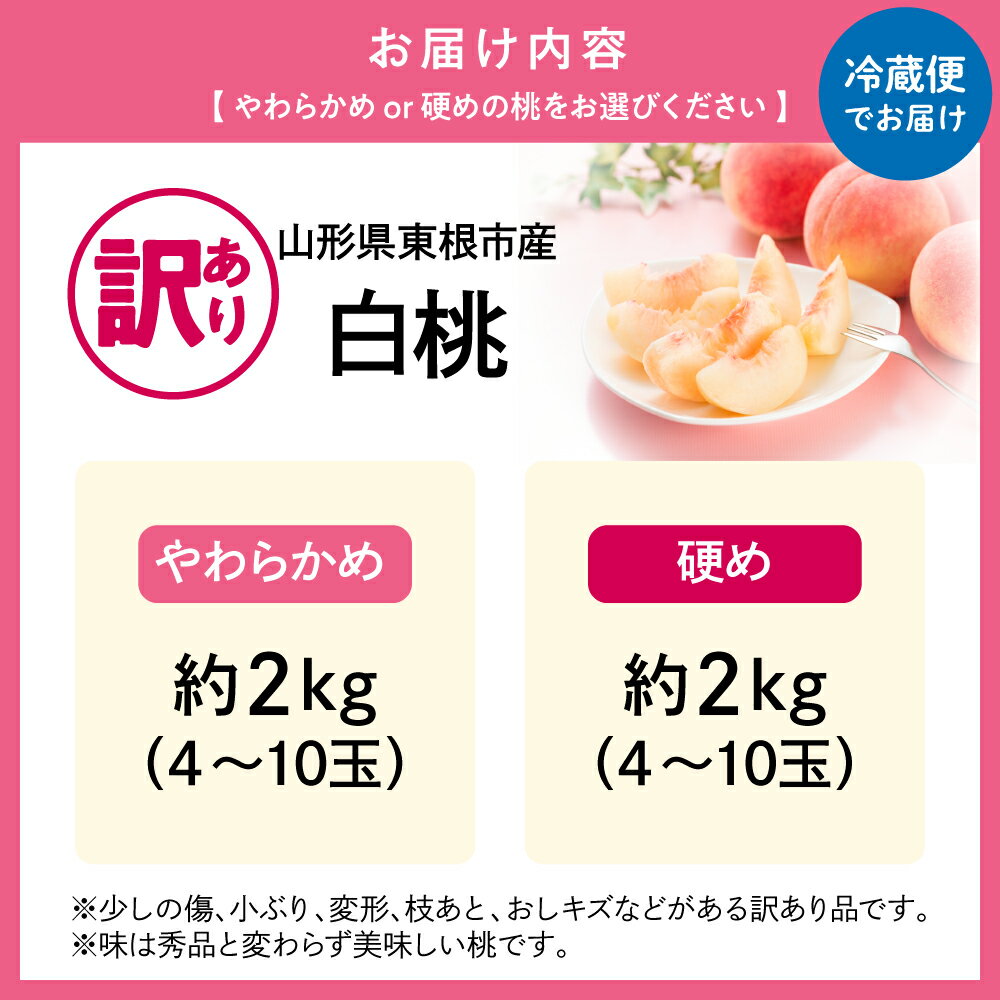 - 【ふるさと納税】2026年産 訳あり 白桃 2kg ( 選べる : 柔らかめ / 硬め )| 桃 もも ピーチ 白桃 はくとう フルーツ 果物 くだもの 傷 規格外 期間限定 大容量 冷蔵配送 先行予約 農家直送 産地直送 お取り寄せ グルメ ご当地 特産 産地 直送 大容量 山形県東根市