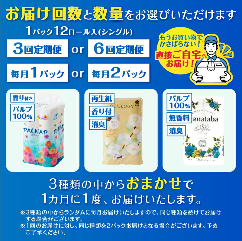 - 【ふるさと納税】 定期便 選べる回数・ロール数 トイレットペーパー シングル 3種 おまかせ 紙のまち富士市 3回/6回 1パック/2パック(1パック12R) 日用品 生活用品 消耗品 防災 備蓄 ランダムにお届け 毎月発送 富士市 [sf002-442-511]