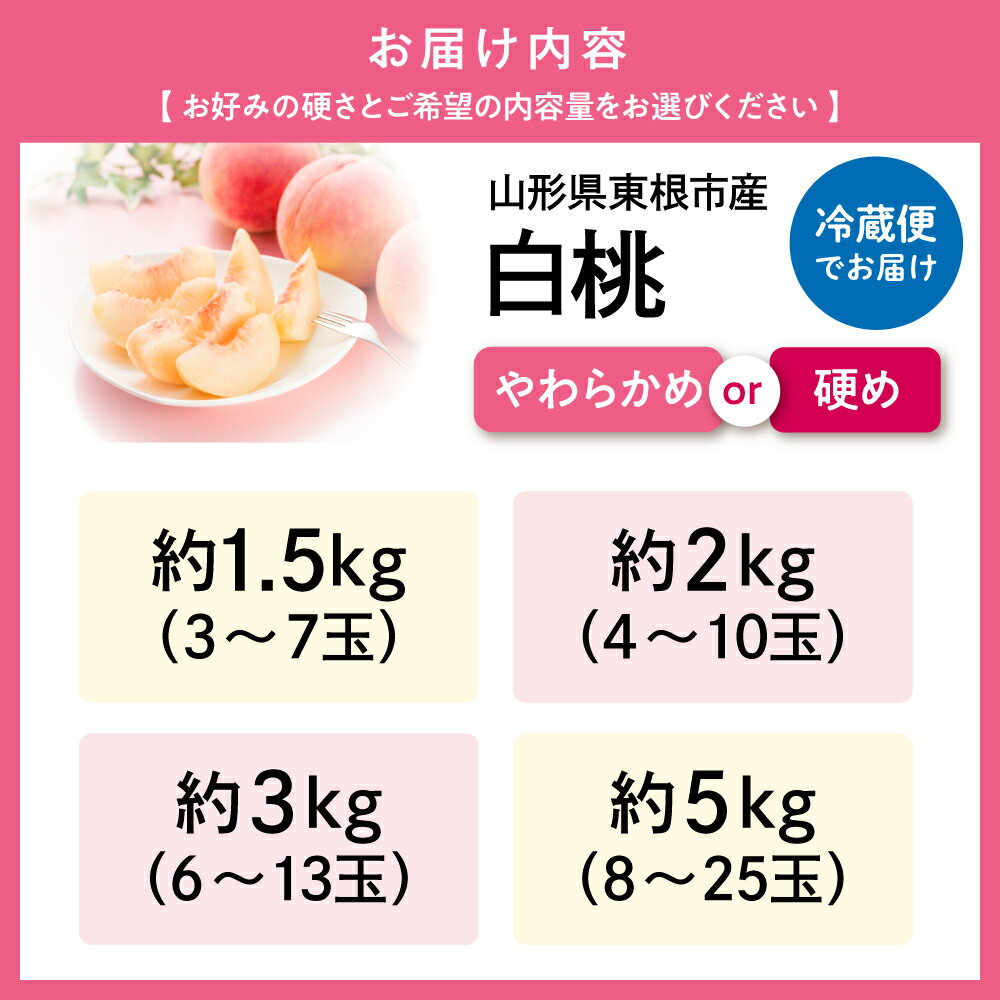 - 【ふるさと納税】2026年産 白桃 ( 選べる : 1.5kg / 2kg / 3kg / 5kg )( 柔らかめ / 硬め )/ 桃 もも モモ ピーチ 白桃 はくとう フルーツ 果物 くだもの 期間限定 大容量 冷蔵配送 先行予約 農家直送 産地直送 お取り寄せ グルメ ご当地 特産 産地直送 山形県東根市