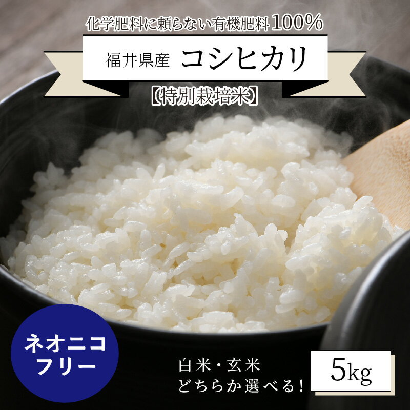 - 【ふるさと納税】【先行予約】【令和8年産・新米】【特別栽培米】福井県産 コシヒカリ 5kg 【2026年10月以降順次発送予定】 〜化学肥料にたよらない有機肥料100%〜 ネオニコフリー 【白米 玄米 米 5キロ お米 ごはん ふるさと納税米 産地直送】