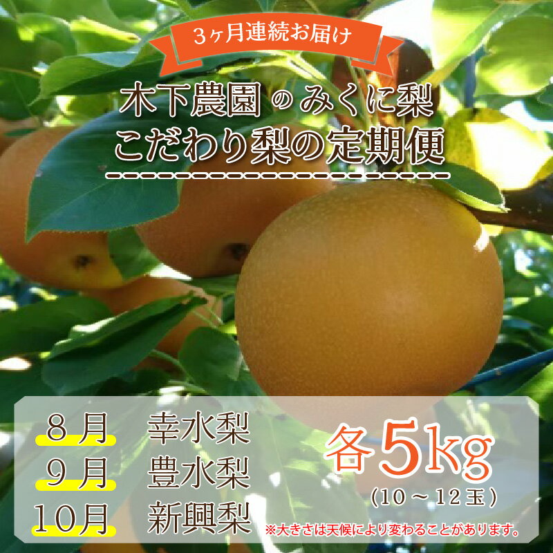 【ふるさと納税】【先行予約】【3ヶ月連続お届け】木下農園のみくに梨 「こだわり梨の定期便」5kg (10〜12玉) × 3回【2026年8月中旬以降順次発送予定】