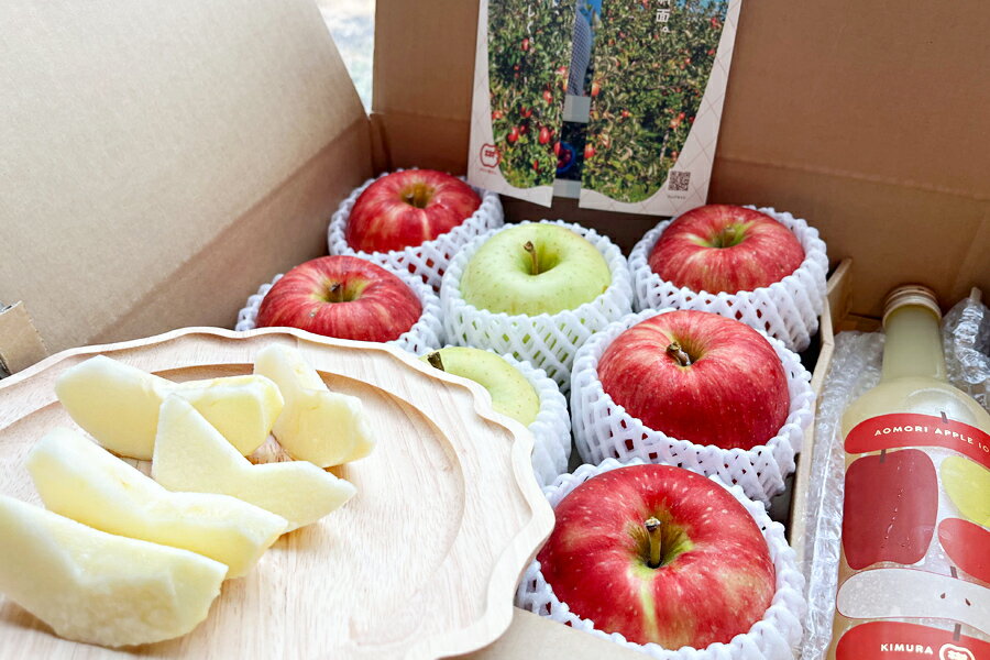 【ふるさと納税】《贈答用》木村農産のりんご詰め合わせ (選べる容量:約3kg/約6kg)・ 黄金比率ブレンド 昔ながらの100%りんご瓶ジュース (選べる本数:720ml×1本/720ml×2本) のセット|青森県産 つがる りんご リンゴ 林檎 ジュース 瓶ジュース [0911-0913]