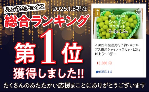 - <2026年発送先行予約>南アルプス市産シャインマスカット1.2kg以上(2~3房) クール便発送 ALPAG007