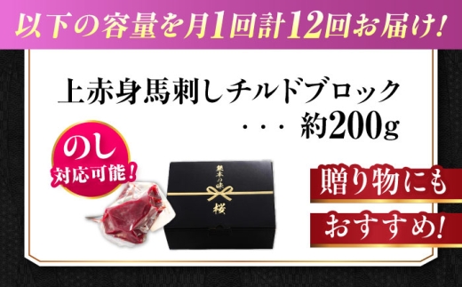 - 【全12回定期便】『純国産』熊本の味 上赤身 馬刺し 約200g ブロック チルド 冷蔵 【有限会社 九州食肉産業】 馬刺し 馬肉 桜肉 馬 うま ウマ ヘルシー 国産 新鮮 上赤身 赤身 上質 小分け セット 大容量 低カロリー 高タンパク 冷凍 生食 生肉 産地 部位 ギフト 贈答用 食品 合志 合志市 [AYCN041]