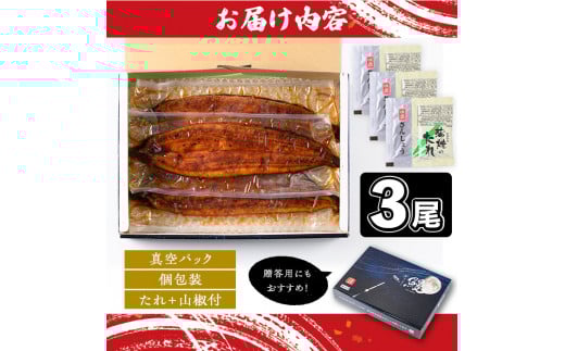 - B57002 うなぎ蒲焼・大(有頭)(3尾・計480g以上、タレ、山椒付)鹿児島 国産 鰻 うなぎ ウナギ 蒲焼き うな丼 うな重 ひつまぶし 土用の丑の日 真空パック お土産 贈答 ギフト プレゼント【一般社団法人きもつき宇宙協議会】
