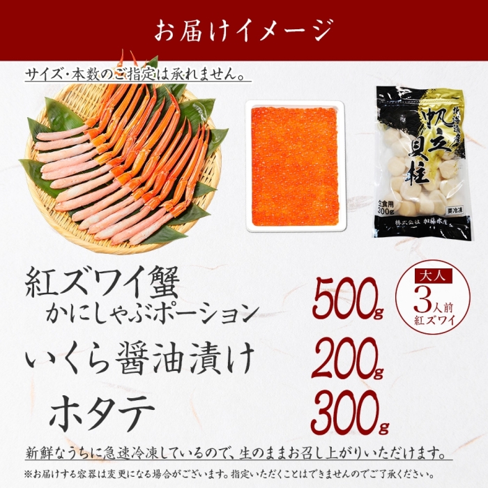 3591. 紅ズワイ蟹ポーション500g前後 生食可 3?4人前 いくら醤油漬け ホタテ 帆立 カニ かに 蟹 ズワイガニ ずわいがに 海鮮 いくら イクラ 魚卵 海鮮丼 送料無料 北海道 弟子屈町