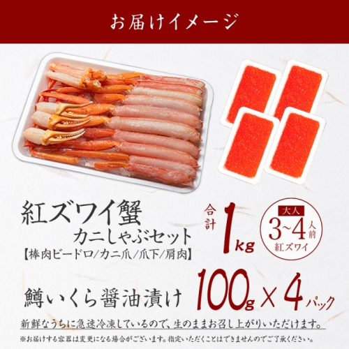 3615. 紅ズワイ 蟹しゃぶ ビードロ 1kg 生食 鱒いくら油漬け 400g 紅ずわい 蟹 カニ 鱒 いくら イクラ しゃぶしゃぶ 鍋 海鮮 カット済 送料無料 北海道 弟子屈町