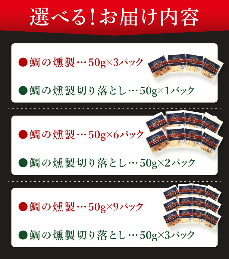 - 【ふるさと納税】【選べる内容量】鯛の燻製 3 or 6 or 9パック 鯛の燻製切り落とし 1 or 2 or 3 パック たい 自然解凍 真空パック スモーク 刺身 冷凍 タイ 魚介 海鮮 大洗 さかな 魚介類 燻製 おかず