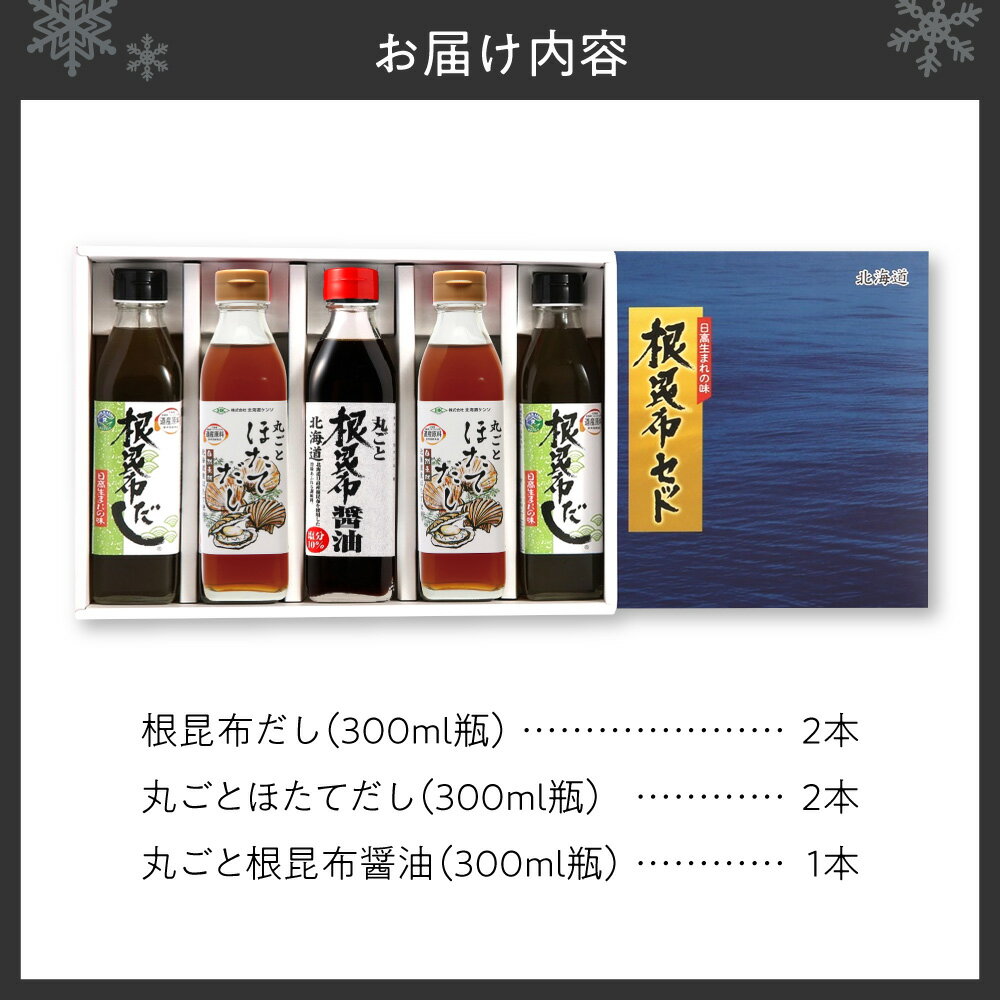 【ふるさと納税】 根昆布だし 根昆布醤油 ほたてだし 3種 セット 300ml 瓶 計5本 お取り寄せ 根昆布 ねこぶだし 昆布エキス 醤油 丸ごと ホタテ ほたて 旨味 詰め合わせ 味比べ 調味料 出汁 だし ギフト 贈答 贈り物 北海道 札幌市