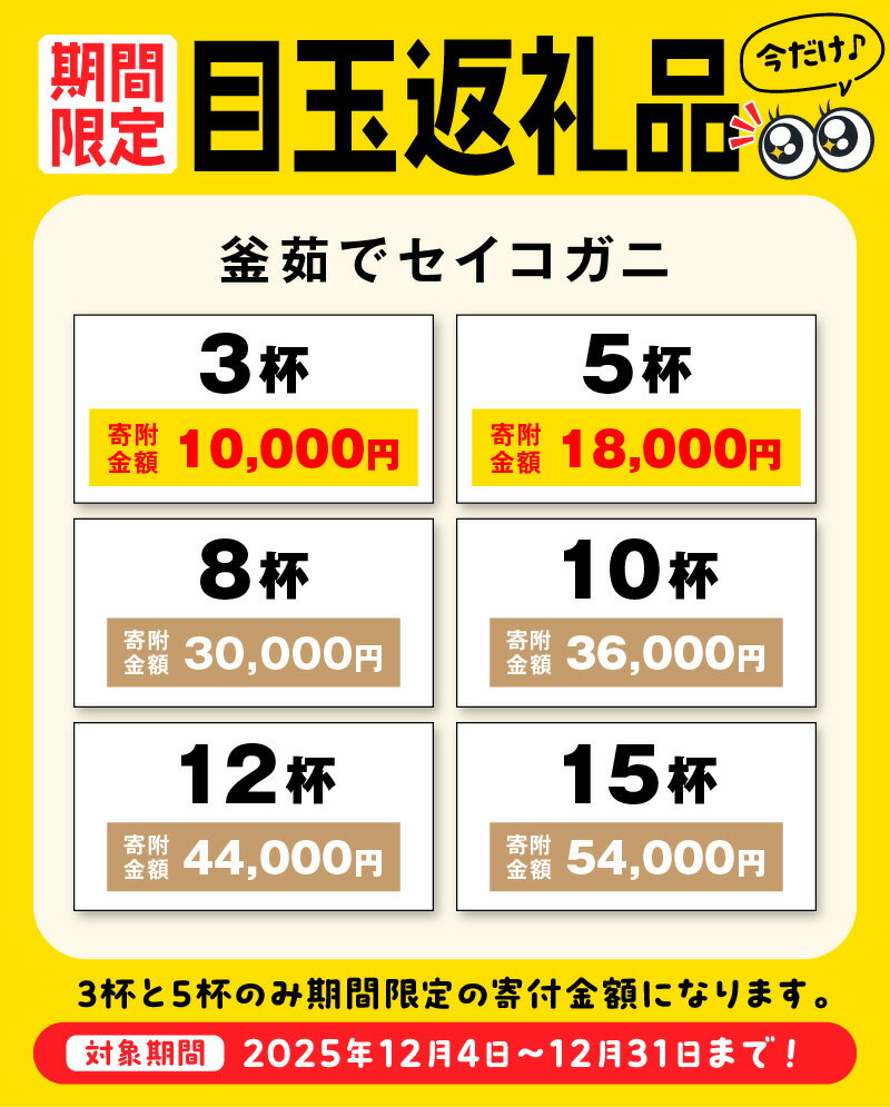 - 【ふるさと納税】茹でたて/TVで紹介されました!【期間エリア限定!】厳選!絶品! 釜茹で セイコ蟹 3杯~15杯 選べる 海鮮 かに カニ 蟹 セイコ蟹 セコガニ せこ蟹 ズワイガニ ズワイ蟹 コッペ ボイル 海産物 魚介類 ふるさと納税 カニ ふるさと納税 セイコガニ