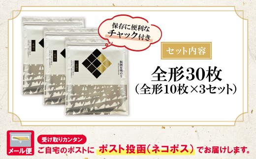 W86-21-01 福岡有明のり(焼のり)全形30枚(全形10枚×3セット) 有明海産の一番摘み限定 のり 海苔 味海苔 おにぎり お弁当 ごはんのお供 人気 海苔 海産物 乾物 おすすめ 海苔 焼きのり