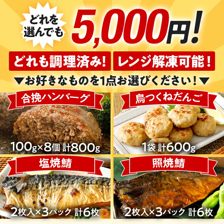 【ふるさと納税】楽天限定 お試し 惣菜 鯖 ハンバーグ つくね 4品から1点選べる惣菜便 全部試せる惣菜便 合挽焼ハンバーグ8個 照焼鯖6枚 塩焼鯖6枚 鳥つくねだんご600g 調理済 レンチン 簡単調理 レンジで簡単 冷凍 お弁当 おかず つまみ CP2511HM