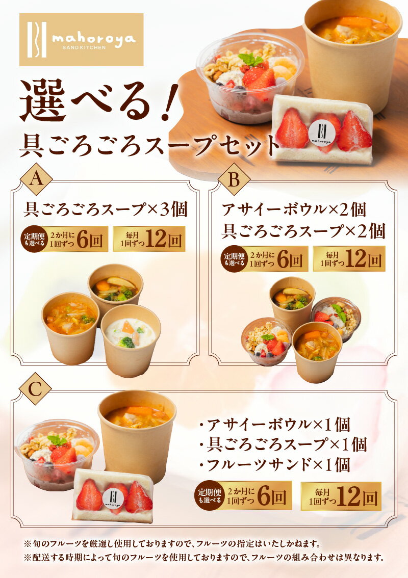 【ふるさと納税】具ごろごろ スープ クラムチャウダー ミネストローネ カレー アサイーボウル フルーツサンド 選べる 回数 定期便 1回 / 6回 / 12回 栄養バランス 満足感 美容 健康 食生活 朝食 軽食 夜食 簡単調理 時短お取り寄せ 大阪府 泉佐野市 送料無料