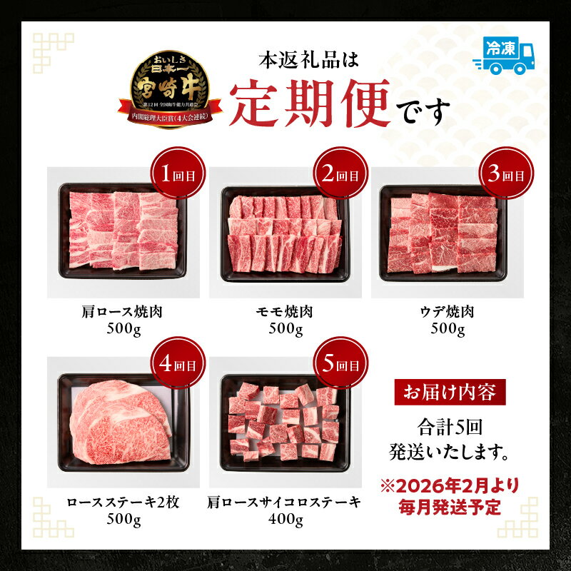 - 【ふるさと納税】【5か月定期便】宮崎牛焼肉定期便 宮崎牛 牛肉 お肉 国産牛 ブランド牛 和牛 焼肉 スライス サイコロステーキ 霜降り 贈答 贈り物 プレゼント 記念日 誕生日 グルメ BBQ 焼き肉 ミヤチク お祝い 宮崎県 高千穂町 送料無料