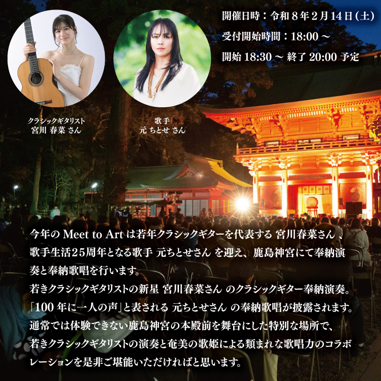 - 令和8年2月14日(土)Meet to Art in 鹿島神宮 1名様席 【奉納演奏 宮川春菜 奉納歌唱 元ちとせ イベント 茨城県 鹿嶋】 (KBW-5)