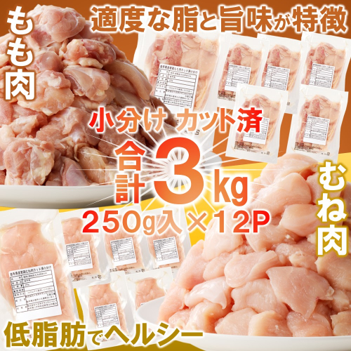 「小分け、カット済、発送月選択可!」岩手県産若鶏 もも肉250g×6P、むね肉250g×6P 計3kgセット 国産 鶏肉 むね もも カット済 小分け 選べる 発送月 冷凍 大容量 業務用 チキン 250g入 計 3.0kg 若鶏 送料無料 唐揚げ おすすめ 便利