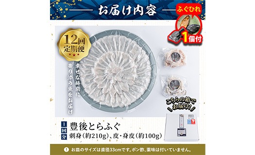 【期間限定・ふぐひれ付】<定期便・全12回 (連続)> 豊後 とらふぐ 刺身 セット (総量約3.7kg:4-5人前×12回) とらふぐ ふぐ フグ ふぐ刺し フグ刺し ふぐ刺身 フグ刺身 刺身 鮮魚 冷凍 養殖 国産 大分県 佐伯市 【AB199-G】【柳井商店】