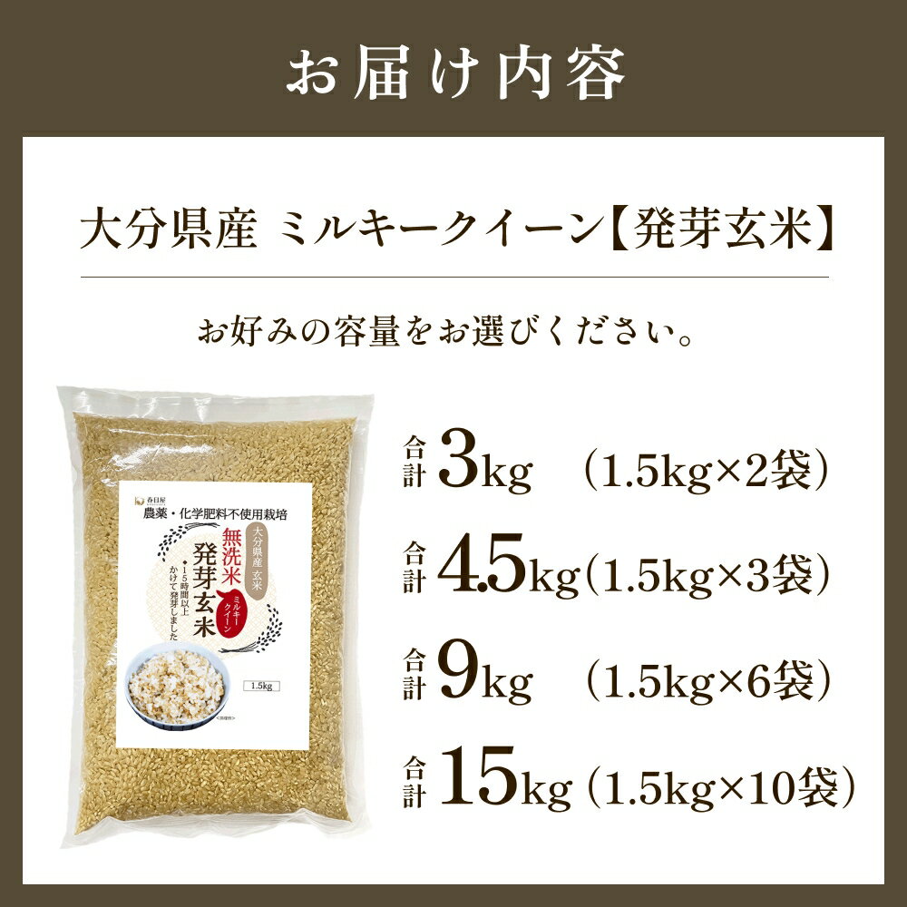 【ふるさと納税】発芽玄米 大分県産 ミルキークイーン 無洗米 〈選べる容量〉3kg~15kg 1.5kg×2~10袋 21000円 ~ 91000円 2万1000円 ~ 9万1000円 栽培期間中農薬・化学肥料不使用 玄米 お米 米 九州 国産 大分県 九重町 送料無料 【2025年10月下旬より順次発送予定】