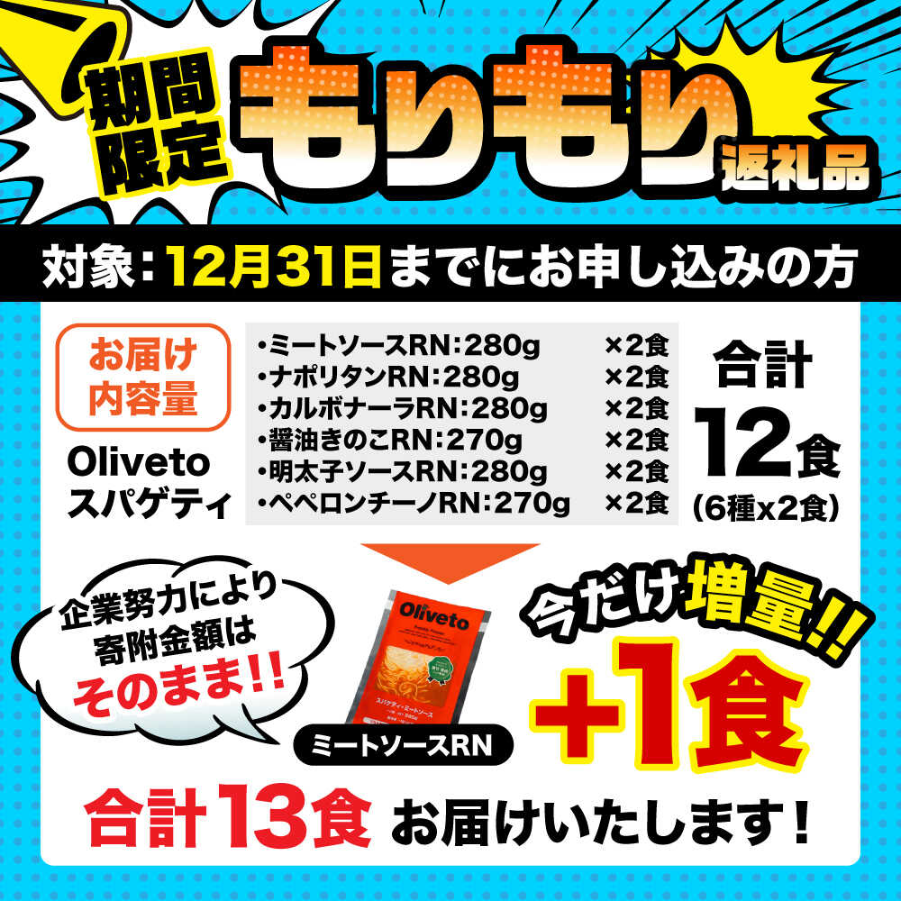 - 【ふるさと納税】植竹隆政シェフ監修 Oliveto スパゲティ6種類x2食+1食 計13食 食べ比べセット / スパゲッティ 簡単 保存 長期保存 セット 麺 麺類 ごはん 冷凍 調理済 熊本県 菊陽【亀井通産株式会社(株式会社マルハニチロ九州)】[BHAY005]