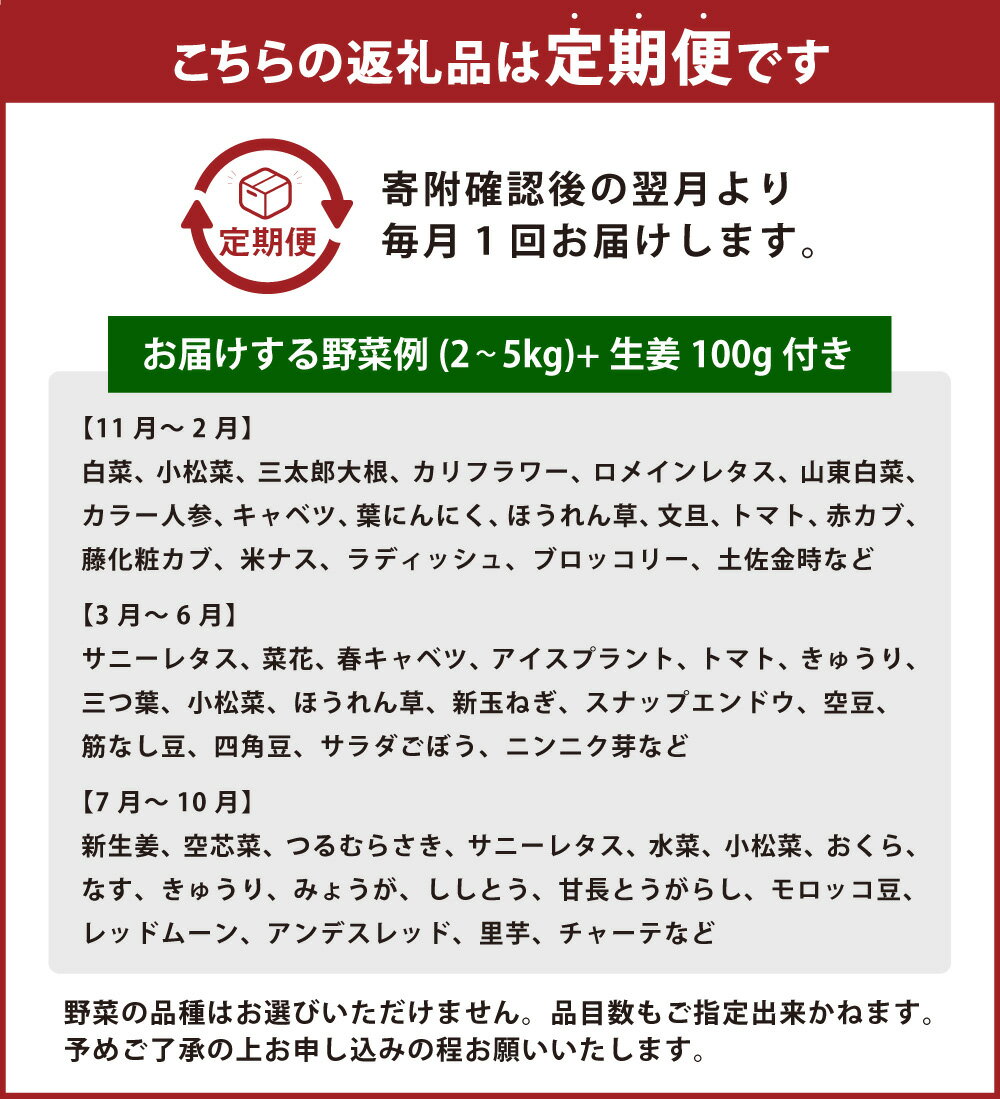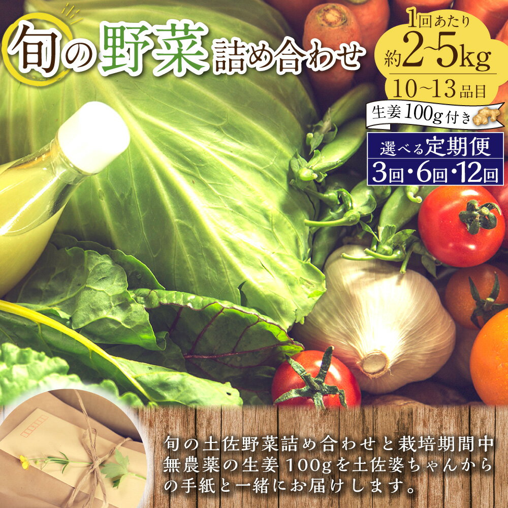 - 【ふるさと納税】<選べる定期便>旬の野菜の詰め合わせと栽培期間中農薬不使用の生姜100g付き 1回あたり2~5kg 3回 6回 12回 野菜 季節の野菜セット 新鮮 安心安全 産地直送 詰め合わせ やさい 自然 自然派 お取り寄せ 高知県 香美市 送料無料
