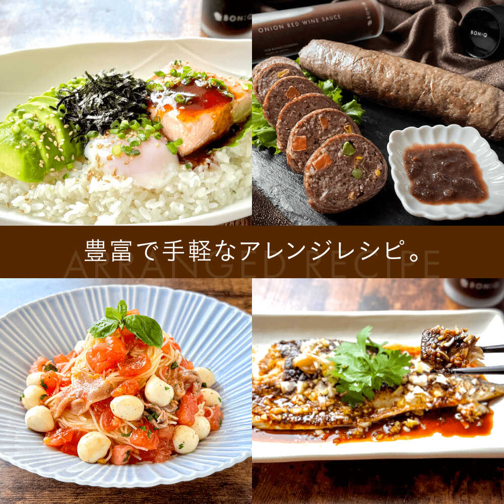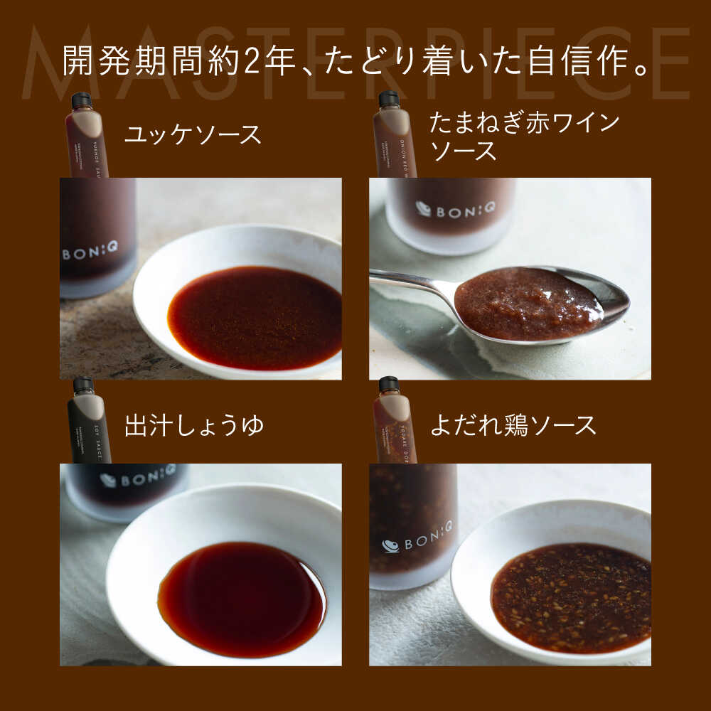 - 【ふるさと納税】BONIQ 特製ソース 4本セット(よだれ鶏ソース、出汁しょうゆ、たまねぎ赤ワインソース、ユッケソース)[ASCL011]