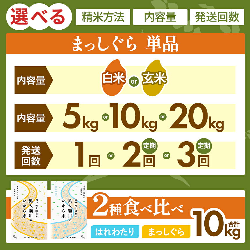 - 【ふるさと納税】米 定期便 あり 選べる 種類 ・ 容量 まっしぐら 白米 or 玄米 or はれわたりとまっしぐら 食べ比べ セット | 5kg 10kg 20kg お米 こめ コメ 2025年産 令和7年度産 国産 産地直送 定期 青森の旨い米グランプリ 最優秀賞 獲得 水稲 宝精米所 青森県 六戸町