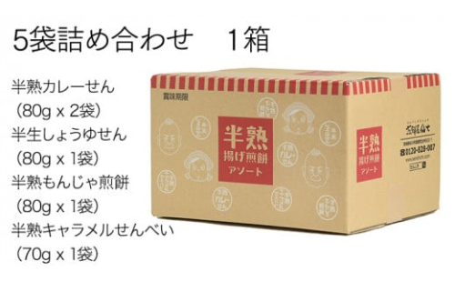 - 半熟せんべい 5袋詰合せ クアトロセット 半熟カレーせん 半生しょうゆせん 半熟もんじゃ煎餅 半熟キャラメルせんべい カレー味 かつおだし 甘辛ソース 新食感 もんじゃ ぬれせんべい せんべい 煎餅 煎餅屋仙七 [AO008sa]