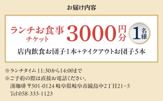 食事券 ランチお食事チケット 【3000円分】 チケット カフェ 利用券 3000円 お食事券 古民家 レトロ おしゃれ 和風 スイーツ 団子 テイクアウト ランチ ランチセット お土産 観光 旅行 デート 女子会 ギフト プレゼント 贈り物 贈答 お返し 内祝い お祝い おすすめ 人気 おいしい 美味しい 岐阜市 / 古民家カフェ 湊珈琲 [ANFY001]