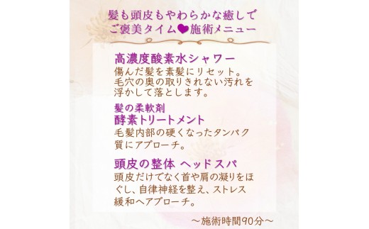 「髪も頭皮もやわらかな癒しでご褒美タイム」ご利用券 ヘッドスパ 酵素トリートメント 高濃度酸素水ケア 90分コース