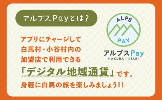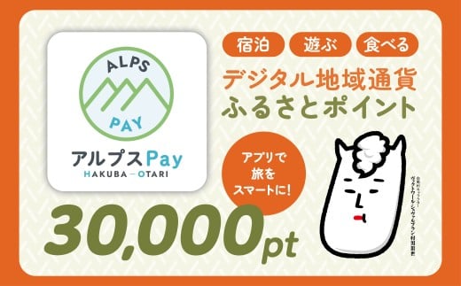 - 白馬村・小谷村 デジタル地域通貨「アルプスPay」 ふるさとポイント30,000pt(30,000円分) アルプスペイ 地域限定通貨 電子決済 キャッシュレス 飲食 宿泊 体験 電子通貨 長野県 北アルプス【L0020680】