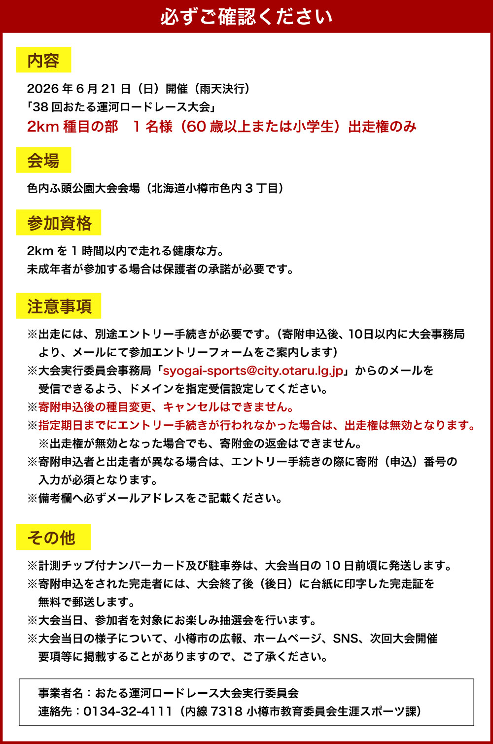 【ふるさと納税】2026年6月21日(日)第38回おたる運河ロードレース大会【2km種目】出走権のみ(60歳以上または小学生) | スポーツ 人気 おすすめ 送料無料