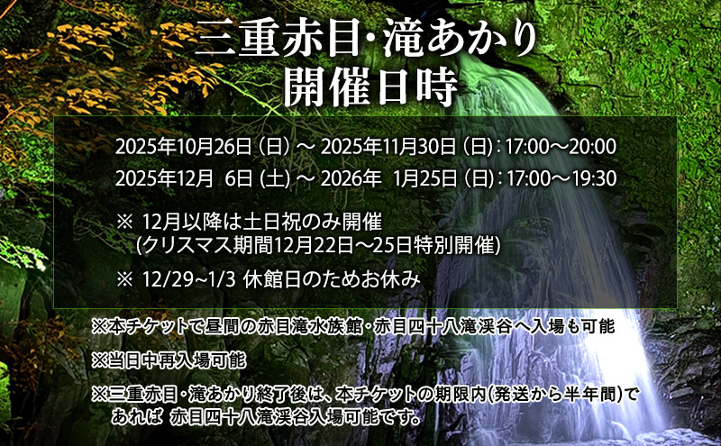 - 【光と水の幻想体験】滝あかりライトアップも楽しめる、赤目四十八滝招待券(3名様)| チケット 券 お出かけ ライトアップ 体験