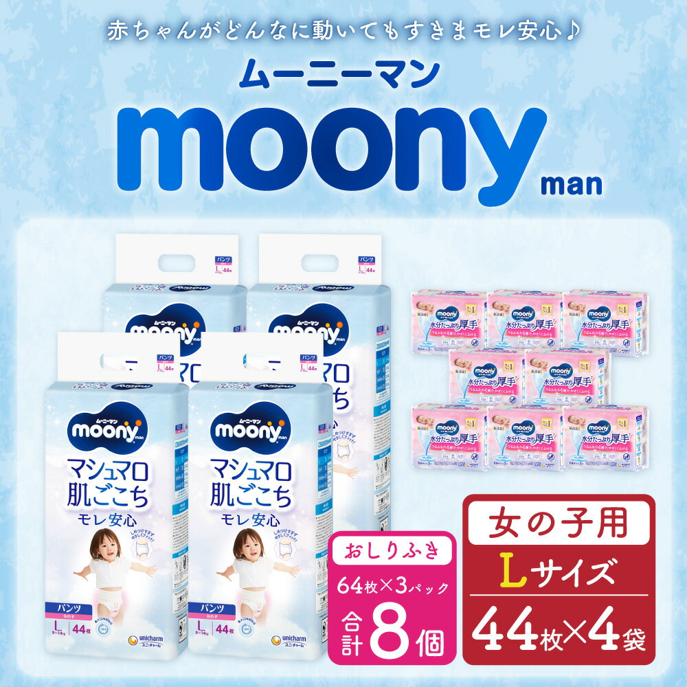 - 【ふるさと納税】ムーニーマン 女の子用 Lサイズ 44枚×4袋 総合計176枚 おしりふき やわらか 厚手 詰替 64枚×3個入×8パック 2種 セット おむつ 子供用 ベビー用品 消耗品 ユニ・チャーム ウエット パンツ 福岡県 苅田町 2個口発送 送料無料