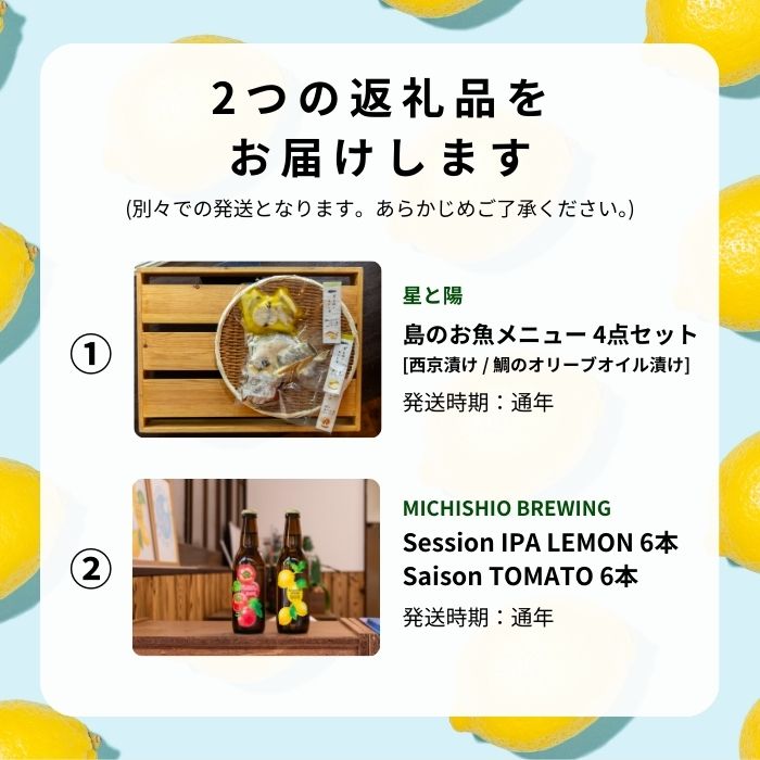 - 【ふるさと納税】島のお魚メニュー 4点セット / 大崎上島のクラフトビール 12本セット [Session IPA Lemon 6本 / Saison TOMATO 6本] 西京漬け 鯛のオリーブオイル漬け レモン 檸檬 瀬戸内レモン トマト クラフトビール 地ビール 爽快 ホップ 晩酌 国産 瀬戸内 広島 離島