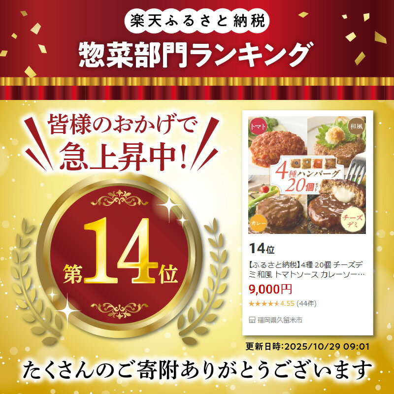 【ふるさと納税】選べる発送月 ハンバーグ 4種 20個 チーズデミ 和風 トマトソース カレーソース 各5個 冷凍 温めるだけ 湯煎 電子レンジ 個包装 小分け 食べ比べ チーズインハンバーグ 夕食 おかず お弁当 簡単調理 時短 お取り寄せ グルメ 福岡県 久留米市 送料無料